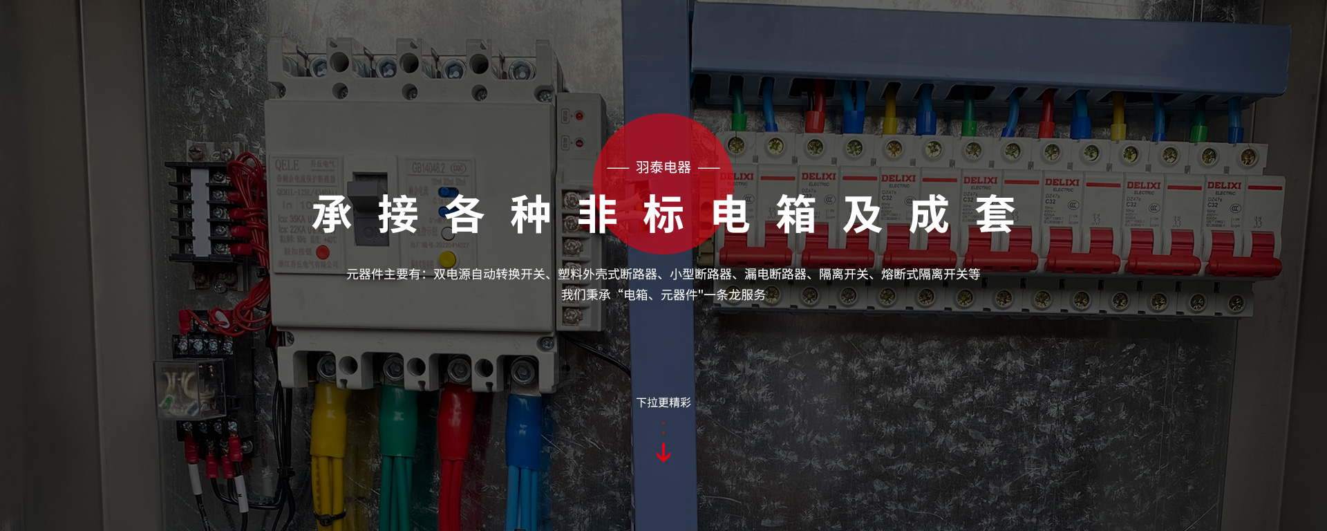 本公司坐落于人杰地靈,“中國制造之都“浙江省臺州市-黃巖。專注工業(yè)電氣領域,是一家集科研、生產、銷售為一體的較全方面型電氣企業(yè)。主要生產:低壓成套配電箱、配電柜、電表箱、動力箱、照明箱、工地臨時箱、設備控制箱,以及各種元器件。元器件主要有:雙電源自動轉換開關、塑料外殼式斷路器、小型斷路器、漏電斷路器;隔離開關、熔斷式隔離開關等,公司產品嚴格按照國家CQC,CCC標準執(zhí)行,滿足于家庭與工業(yè)要求。我們秉承“電箱、元器件"一條龍服務。